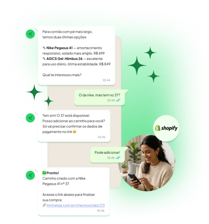 Com a integração da Loopia com a Shopify, esse caminho acabou. O agente de IA conduz a conversa, entende o que o cliente quer, adiciona o produto ao carrinho e envia o link direto para o pagamento. O cliente só precisa confirmar. É o checkout mais curto que existe.
